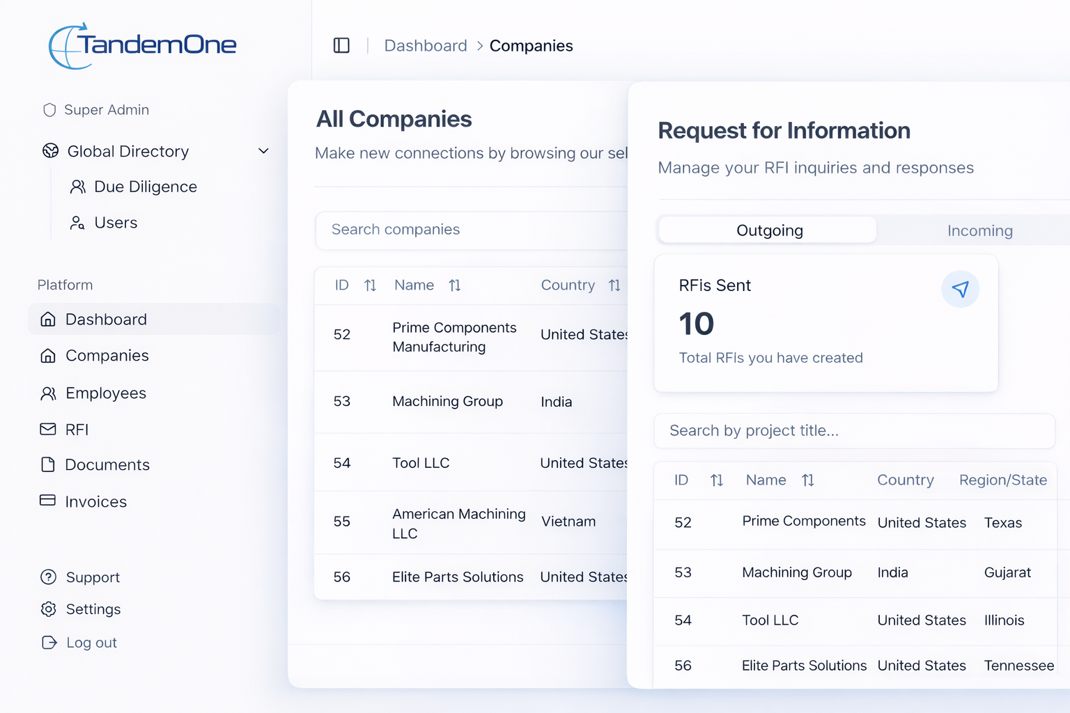 TandemOne helps industrial buyers find, validate, and activate verified suppliers before RFQs, Quotes, or contracts begin.